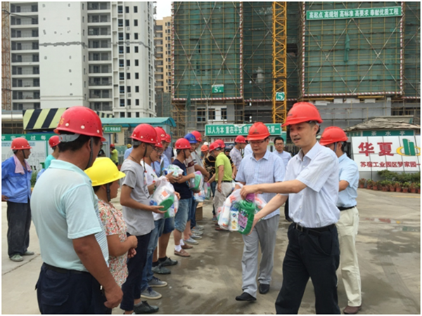 2016年7月27日上午,為切實(shí)做好建筑工地防暑降溫工作,讓施工人員在溫馨的工作環(huán)境中安全作業(yè),園區(qū)黨工委委員、管委會(huì)副主任、規(guī)劃建設(shè)局局長(zhǎng)許紹杰、副局長(zhǎng)張循在開發(fā)公司副總裁劉建華的陪同下冒著酷暑慰問夢(mèng)家園工地一線施工人員。