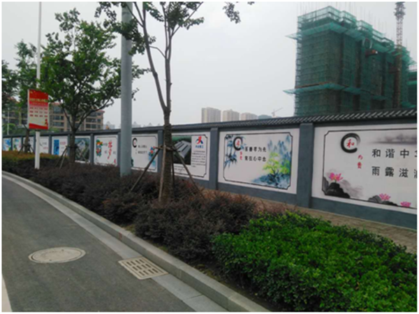 目前,現(xiàn)場各項安全文明設(shè)施正在緊鑼密鼓的建設(shè)中,其中臨時圍墻不僅是工地對外展示的第一形象,也是企業(yè)宣傳、安全宣傳、方案公示等信息的展示平臺。項目部通過人工手繪結(jié)合局部噴繪的方式既宣傳了創(chuàng)文、創(chuàng)衛(wèi)、核心價值觀的標(biāo)語,又營造了“青磚綠瓦”的江南韻味。為園區(qū)的創(chuàng)文建設(shè)增添了新的亮點(diǎn)。