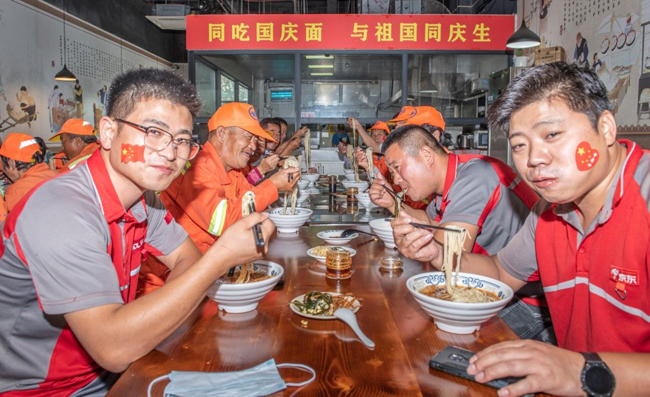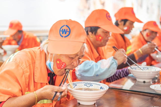 一碗“國慶面”,一份愛國情。當(dāng)一碗碗熱氣騰騰、香氣撲鼻的面條送到環(huán)衛(wèi)工人、快遞小哥等堅(jiān)守在一線崗位上的工作人員手中,大家接過面條,享用著寓意美好的“國慶面”,每個人的臉上都洋溢著幸福和快樂的笑容。大家用最樸素最平常的食物,表達(dá)了對祖國母親生日快樂的真摯情感。