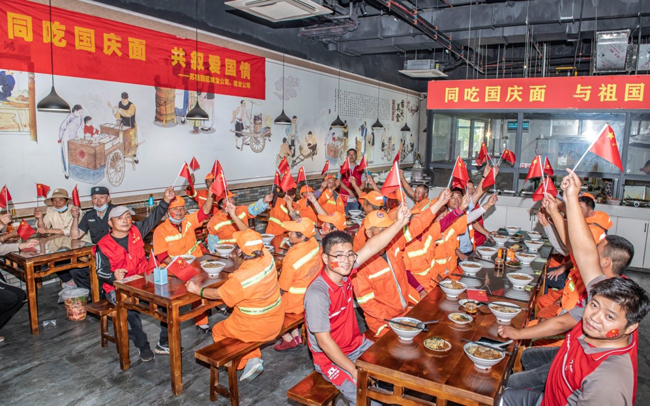 為喜迎中華人民共和國成立73周年,9月30日上午,蘇宿工業(yè)園區(qū)城發(fā)公司、建發(fā)公司在陽澄鄰里中心“陸長興”面館開展“同吃國慶面 共敘愛國情”主題活動,邀請園區(qū)環(huán)衛(wèi)工人、保安、保潔和快遞小哥代表,以同吃一碗“國慶面”的“新民俗”方式歡度國慶,在歡歌笑語中,敘說家國情懷。
