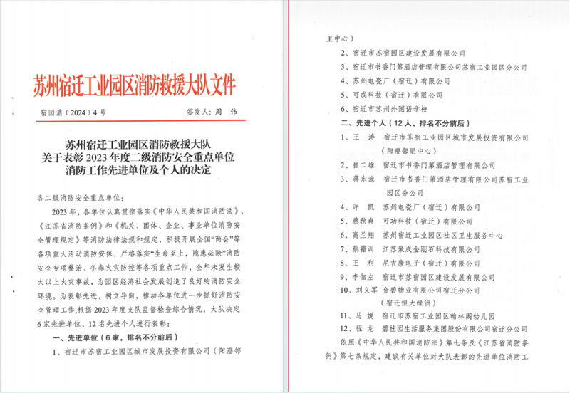 近期,陽澄鄰里中心獲評園區(qū)“2023年度消防安全管理工作先進(jìn)單位”,公司消防安全管理員王濤獲得園區(qū)“2023年度消防安全管理工作先進(jìn)個(gè)人”。