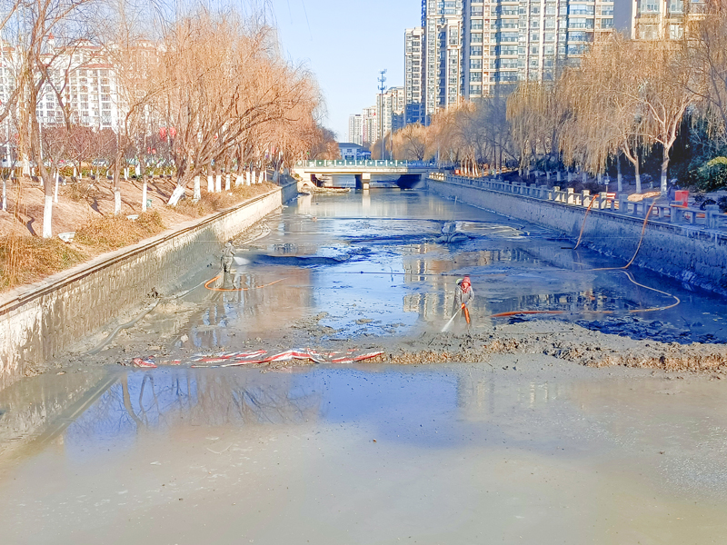 園區(qū)利民河全長1.1公里、寬20米,為區(qū)內(nèi)景觀河。經(jīng)前期摸排,河道內(nèi)淤泥沉積較多,影響河道自凈能力。城發(fā)公司克服冬季氣溫低、斷面長、施工難等不利因素,采用泥漿泵配合高壓水槍射水,管道封閉運輸?shù)氖┕し椒ǎ謇碛倌嗉s8500立方米,高效完成河道清淤工作。