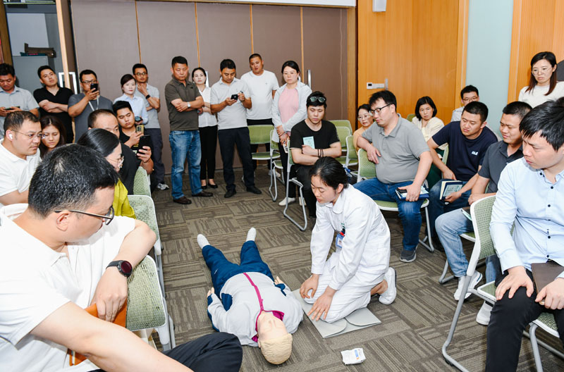 在第一階段活動(dòng)現(xiàn)場(chǎng),醫(yī)護(hù)人員通過PPT的形式,為大家詳細(xì)講解了心肺復(fù)蘇、AED使用、海姆立克急救法的操作要點(diǎn)和注意事項(xiàng),以及夏季高溫中暑的自救互救應(yīng)急處理知識(shí),并通過互動(dòng)方式一對(duì)一指導(dǎo)教學(xué),鍛煉了實(shí)際操作能力。隨后,醫(yī)護(hù)人員也為在場(chǎng)職工進(jìn)行血壓、血糖等項(xiàng)目測(cè)量,中醫(yī)把脈問診、家庭醫(yī)生簽約等便民服務(wù),參加此次活動(dòng)的職工紛紛表示受益匪淺。