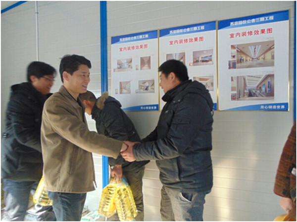 近日,園區(qū)開(kāi)發(fā)公司黨支部開(kāi)展春節(jié)前夕走訪(fǎng)慰問(wèn)活動(dòng),對(duì)公司在建工程工地的10余名生活困難工人進(jìn)行了慰問(wèn),為他們送上慰問(wèn)品,帶去節(jié)日的問(wèn)候。公司黨支部書(shū)記、副總裁劉建華參加活動(dòng)。