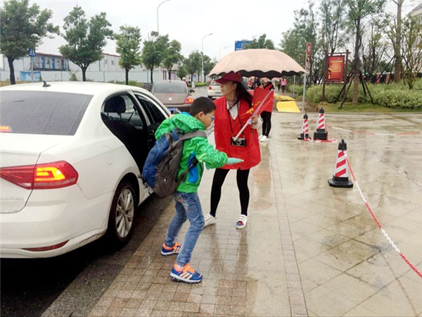 10月21日上午,第一組家長(zhǎng)志愿者首次上崗,他們?cè)谟曛兄笓]車輛、疏導(dǎo)交通,用實(shí)際行動(dòng)為孩子們撐起了一把“愛心保護(hù)傘”。